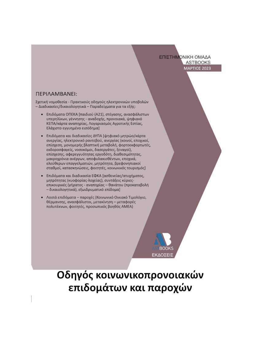 Η νέα εμπλουτισμένη έκδοση της Astbooks «Οδηγός κοινωνικοπρονοιακών επιδομάτων και παροχών» συνεχίζει την προσπάθεια καταγραφής και περιγραφής των κοινωνικών παροχών/επιδομάτων (ΟΠΕΚΑ, ΟΑΕΔ, ΕΦΚΑ κ.λπ.) που υλοποιούνται στα πλαίσια της κοινωνικής πολιτικής της χώρας.