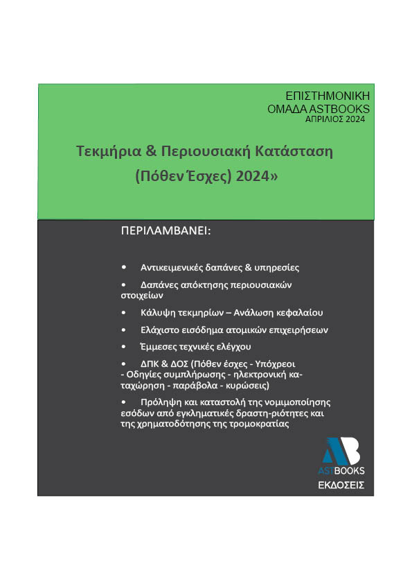 Η νέα έκδοση της Astbooks με τίτλο «Τεκμήρια & Περιουσιακή Κατάσταση (Πόθεν έσχες) 2024» αποτελεί έναν οδηγό για τον εναλλακτικό τρόπο υπολογισμού της ελάχιστης φορολογίας βάσει των αντικειμενικών δαπανών και υπηρεσιών και των δαπανών απόκτησης περιουσιακών στοιχείων, όπως προσδιορίζεται από τα άρθρα 30-34 του Κεφαλαίου Δ’ του Κώδικα Φορολογίας Εισοδήματος (ΚΦΕ -ν.4172/2013).